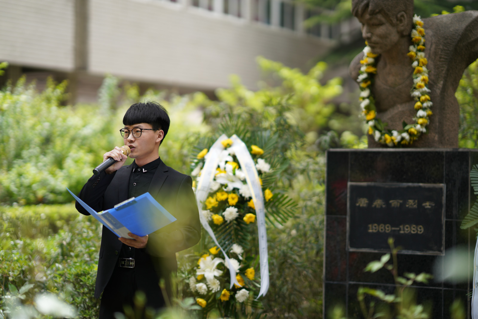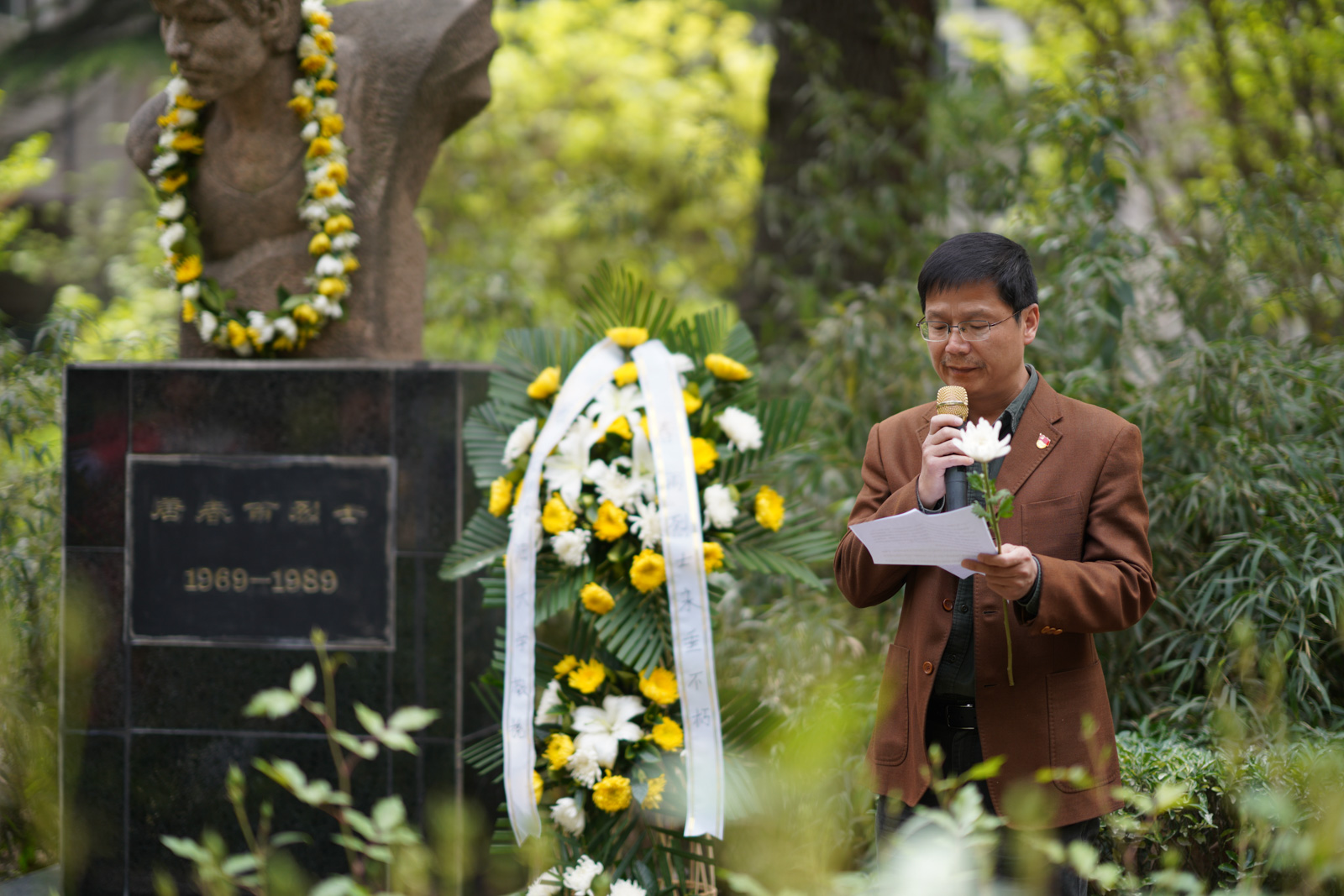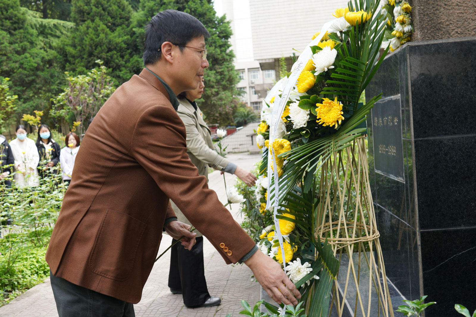 悼念活動在低沉的獻花曲中展開,主持人為同志們詳細介紹了唐春雨烈士的英雄事跡,研究生工作部部長高榮芳、石油工程學院黨委書記馬勇仔細整理花籃綢帶,深切緬懷春雨烈士。