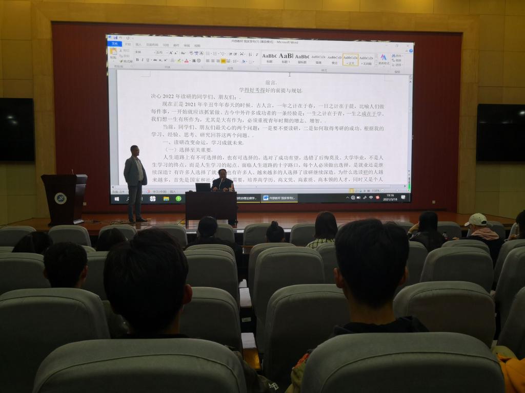 樊曉旭老師以“我和我的大學(xué)”為主題,循循漸進(jìn)的和同學(xué)們分享了大學(xué)階段的目標(biāo)和任務(wù),歡樂(lè)和喜悅。他帶領(lǐng)同學(xué)們共同完成了“人生年線”和畫“豬”游戲,在游戲中讓同學(xué)們感受到用于學(xué)習(xí)、拼搏的時(shí)間短暫,感受到由于自身性格的不同直接會(huì)影響對(duì)未來(lái)?yè)駱I(yè)的選擇標(biāo)準(zhǔn)不同。樊處長(zhǎng)給同學(xué)們提出了三點(diǎn)建議:一是要有時(shí)間的緊迫感,大三年級(jí)階段要切實(shí)體會(huì)到時(shí)間的重要性,要做時(shí)間的“掌控者”;二是要有明確的目標(biāo)定位,三年級(jí)就要做好考研、就業(yè)、入伍、考公和考編的充分準(zhǔn)備,要做未來(lái)的“自主者”;三是要珍惜同學(xué)情誼,三年的相處讓同學(xué)們心心相惜(惺惺相惜),珍惜大學(xué)的同窗之情,要做同學(xué)友情的“傳播者”。
