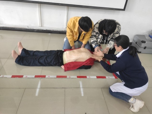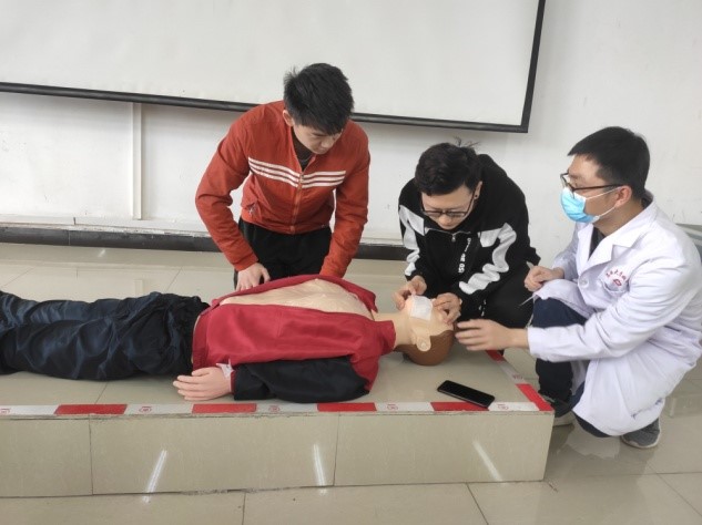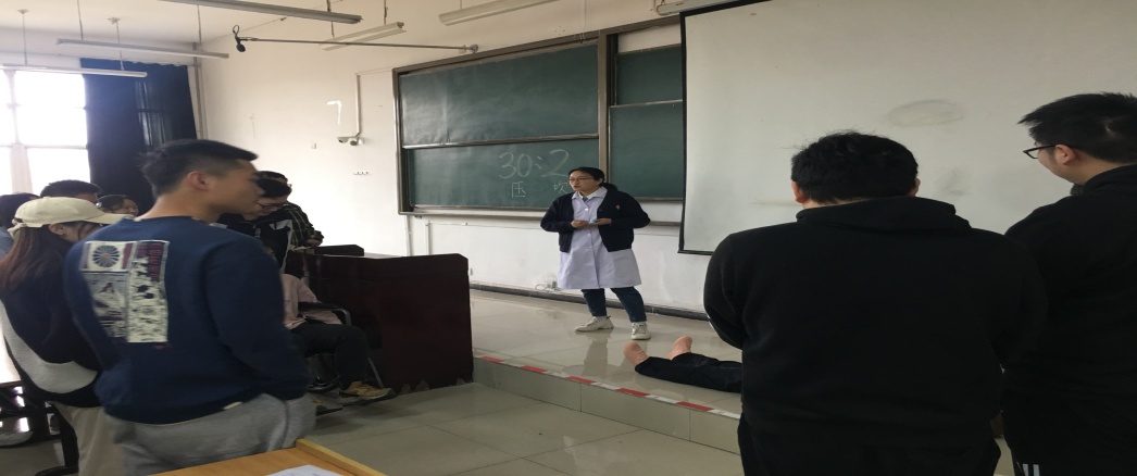 此次培訓(xùn)活動(dòng)內(nèi)容為:趙利劍醫(yī)師給同學(xué)們講解了理論知識(shí),包括創(chuàng)傷急救的應(yīng)急處理、心肺復(fù)蘇的流程及操作要點(diǎn)、燒燙傷及電擊傷的分級(jí)處理、急性CO中毒和火災(zāi)的應(yīng)對(duì)方法等等。講解結(jié)束后由劉偉醫(yī)師和宋彥霞護(hù)師對(duì)同學(xué)們就心肺蘇復(fù)實(shí)際操作過(guò)程進(jìn)行了詳細(xì)的指導(dǎo)。