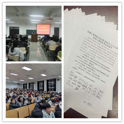 127-9日,機(jī)械工程學(xué)院分年級、分批次召開英語四六級考試誠信教育大會(huì),各年級輔導(dǎo)員老師主持會(huì)議,大會(huì)分別做考前動(dòng)員和誠信教育。