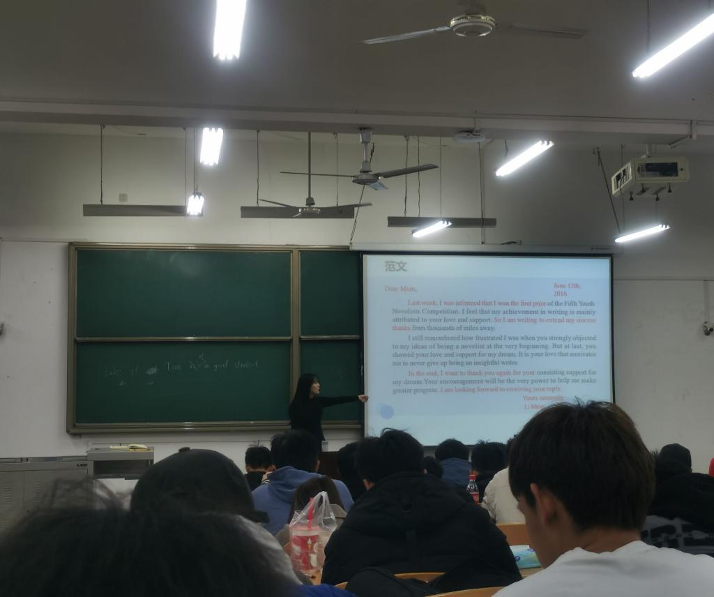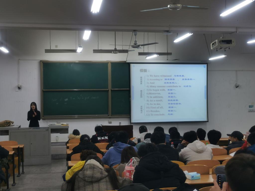 本次講座主題為英語(yǔ)四級(jí)作文強(qiáng)化訓(xùn)練。講座開(kāi)始前,李老師和同學(xué)們講述了自己學(xué)習(xí)英語(yǔ)的經(jīng)歷及備考英語(yǔ)專(zhuān)業(yè)八級(jí)寫(xiě)作模塊的技巧,同時(shí)記錄了同學(xué)們?cè)趯?xiě)作模塊遇到的問(wèn)題和困擾。講座中,李老師首先從閱卷人視角,為同學(xué)們講解了寫(xiě)作得分要點(diǎn),要求各位同學(xué)在考試中做到字體工整、卷面整潔,注意語(yǔ)言正確性與多樣性。隨后,李老師為同學(xué)們講解了書(shū)信作文、圖表作文、三段式作文寫(xiě)作方法及常用句式。李老師和同學(xué)們?cè)诂F(xiàn)場(chǎng)共同背誦作文常用句式及模板,同學(xué)們用真題進(jìn)行現(xiàn)場(chǎng)寫(xiě)作演練。最后,李老師鼓勵(lì)同學(xué)們認(rèn)真復(fù)習(xí)、努力備考,爭(zhēng)取高分通過(guò)英語(yǔ)四六級(jí)。