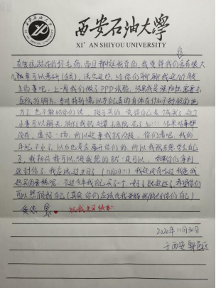 我院2020級輔導員李昱昊在總結(jié)活動時強調(diào):社會在不斷發(fā)展,時代在不斷進步。越來越多的人通過語音視頻等方式向親人表達問候,但其實這種方式會有許多感恩的話語難以用語言表達,本次活動旨在于引導大家通過傳統(tǒng)的書信加深與父母及親友的情感溝通,懂得體會父母的不易,懂得父母的辛苦付出和默默承擔,培養(yǎng)大家的感恩意識、責任意識、獨立人格。