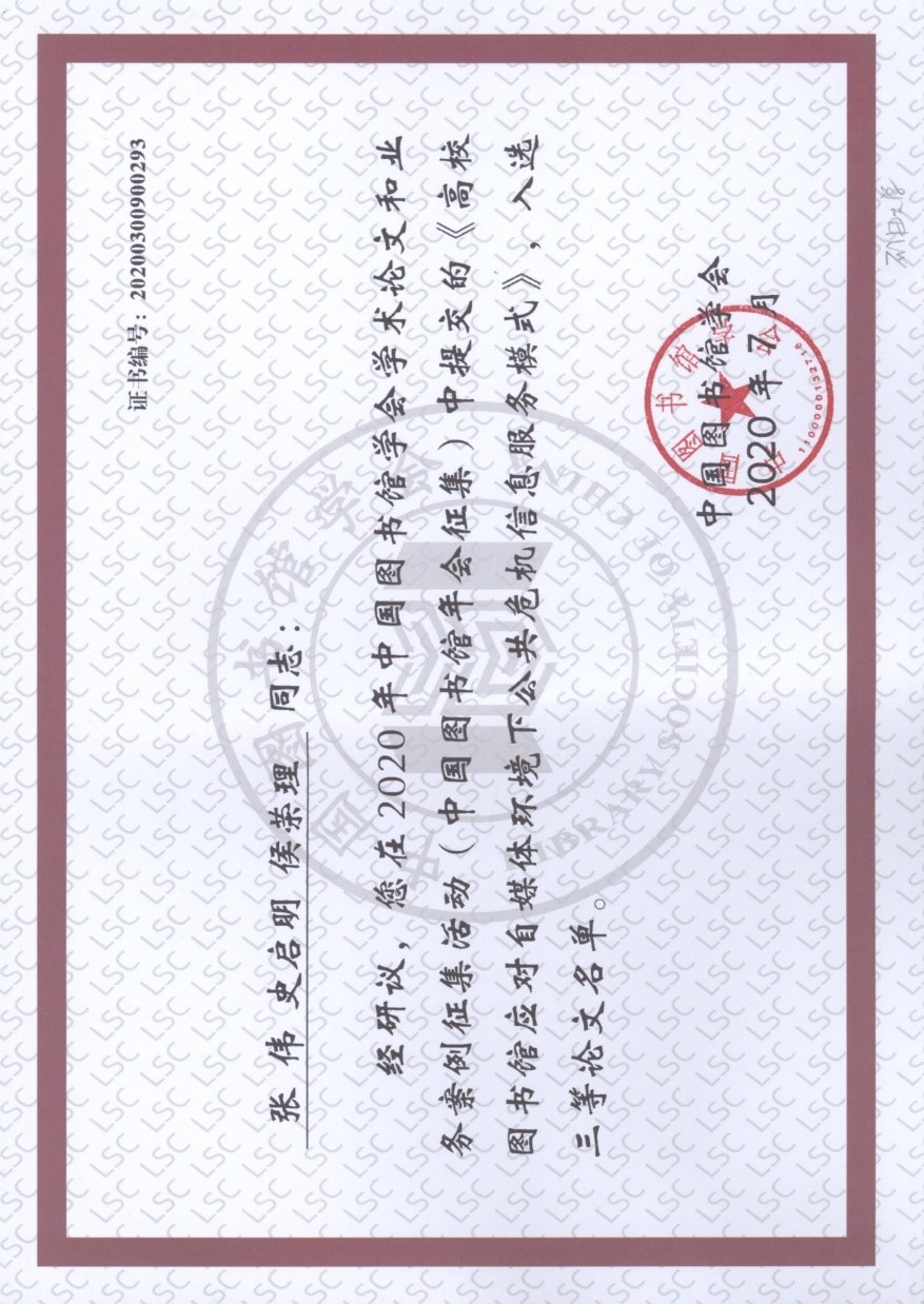 近日,我校圖書館張偉、史啟明、侯榮理提交的論文《高校圖書館應(yīng)對自媒體環(huán)境下公共危機信息服務(wù)模式》入選2020年中國圖書館年會論文征集,榮獲三等獎。