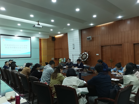 王業(yè)青副書記首先宣讀了《外國語學院關于聘任2020-2021學年班主任的決定》和《外國語學院關于2020-2021學年本科生學業(yè)導師配備的通知》,通報了2020-2021學年學院學生日常思想教育、學風建設、隊伍建設和就業(yè)創(chuàng)業(yè)工作的具體安排,布置了本學年本科生學業(yè)導師、班主任工作具體工作任務,希望受聘任的本科生學業(yè)導師、班主任老師積極履職擔當,在學生管理、穩(wěn)定安全、主題班團會、學生活動等方面給予學生督促和指導。