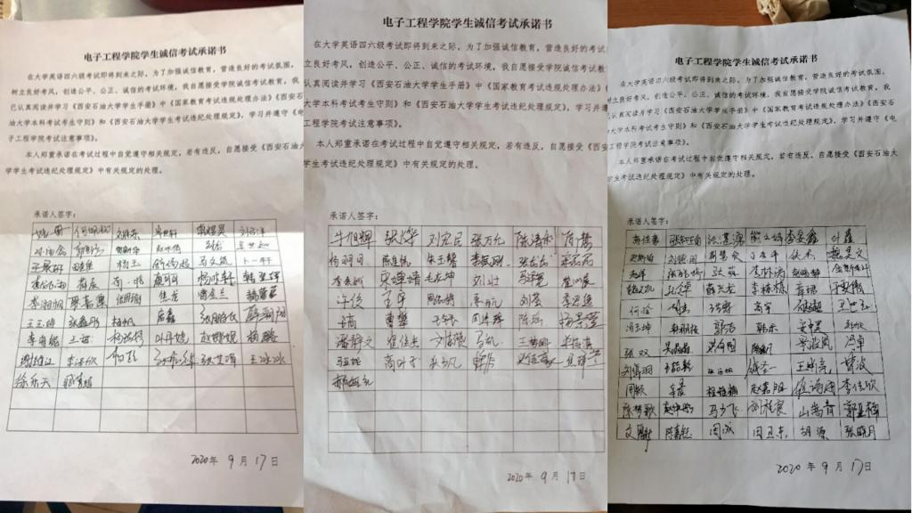 9月5日至6日組織我院學生簽署誠信考試承諾書。為進一步增強學生誠信意識,將誠信考試落到實處。各班通過組織學生簽署誠信考試承諾書這一儀式,確保將考試相關(guān)紀律要求傳達給每一名學生,要求學生們謹記承諾內(nèi)容,克服僥幸心理,認真?zhèn)淇迹杂X抵制作弊行為。