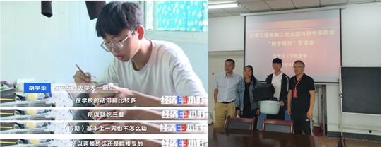 胡宇華來自貴州省畢節(jié)市大方縣,是我院2020級化學(xué)工程與工藝專業(yè)新生,他刻苦努力,自強不息的求學(xué)之路,經(jīng)央視財經(jīng)頻道《經(jīng)濟半小時》欄目報道后,得到社會各界的廣泛關(guān)注。學(xué)校通過媒體立即聯(lián)系學(xué)生本人,并啟動相關(guān)資助程序;校領(lǐng)導(dǎo)在學(xué)生處的各位領(lǐng)導(dǎo)的陪同下也在報名當(dāng)天看望了胡宇華同學(xué)及其母親,并為其送去了免費被褥用品領(lǐng)取券,減輕了生活上的負擔(dān)。學(xué)院黨委了解到情況后,及時與胡宇華同學(xué)取得聯(lián)系,安排輔導(dǎo)員專門與學(xué)生具體溝通并給給予相關(guān)幫助。同時,榮獲了陜西省2020年高等教育師德建設(shè)示范團隊稱號的化學(xué)工程系黨支部主動匯報學(xué)院黨委,擬啟動支部與胡宇華同學(xué)的對口助學(xué)幫扶活動,希望通過化工系教工黨支部的力量,給予該同學(xué)大學(xué)四年期間學(xué)業(yè)生活持續(xù)幫扶,使其在學(xué)業(yè)上能取得更大的成就,以此來回報父母、回報社會。