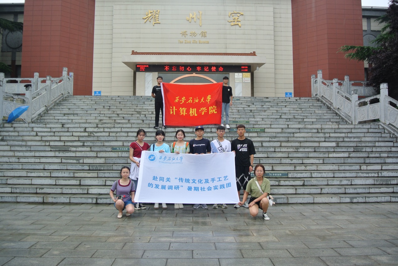 為了引導(dǎo)青年了解傳統(tǒng)文化,根據(jù)校團委統(tǒng)一部署,8月1日至8月4日,西安石油大學(xué)計算機學(xué)院赴同關(guān)“傳統(tǒng)文化及手工藝的發(fā)展調(diào)研”暑期社會實踐團隊由指導(dǎo)教師王天航帶領(lǐng)下,前往銅川開展了為期四天的社會實踐活動。