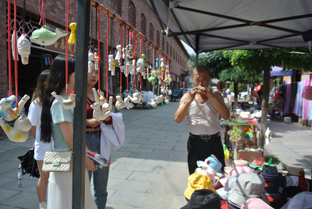 還有各式樣的陶瓷玩具,在販攤上最吸引游客的便是陶笛類的樂器。在一家攤販前,買陶塤的大叔還為我們現(xiàn)場表演了一番那件海豚形狀的陶器樂器。陶器不僅僅用于器具,觀賞性的擺件,在這里也被發(fā)掘為一種樂器,豐富的形式讓這件工藝品更具價值。不由得讓人心動購買它。在鎮(zhèn)子里還可以親手制作陶器,親身感受陶文化的魅力。這里不需要解說,那些肉眼可見的陶器,指尖觸碰到的古鎮(zhèn),都訴說著這個古鎮(zhèn)的點點滴滴。