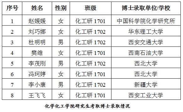 化學(xué)化工學(xué)院院2020屆共有62名碩士畢業(yè)生,已全部就業(yè),就業(yè)率100%,達到歷年來最高水平;其中,12人報考了博士研究生,報考率19.35%,最終有8人順利被國內(nèi)有關(guān)科研院所和高校錄取為博士研究生,博士升學(xué)率達12.9%,創(chuàng)下歷年來我院博士研究生升學(xué)率新高。
