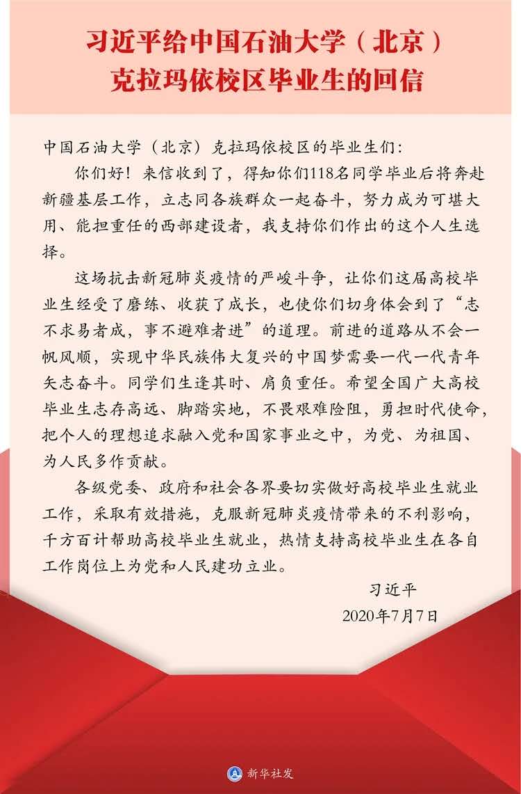 中共中央總書記、國家主席、中央軍委主席習近平7月7日給中國石油大學(北京)克拉瑪依校區(qū)畢業(yè)生回信,肯定他們到邊疆基層工作的選擇,對廣大高校畢業(yè)生提出殷切期望。習近平總書記這封飽含期待與鼓勵的回信,在機械工程學院青年學子中迅速引發(fā)了熱議。