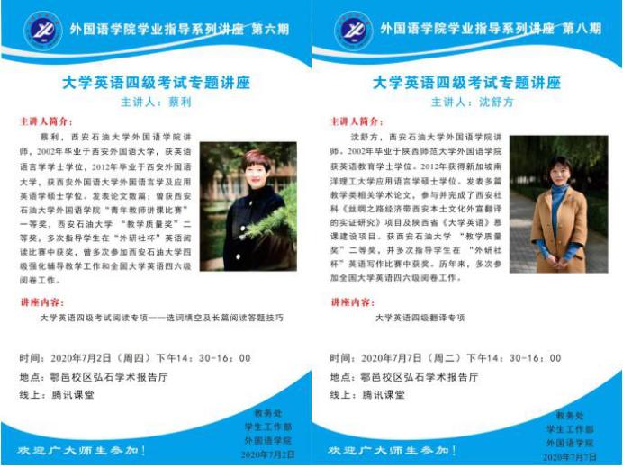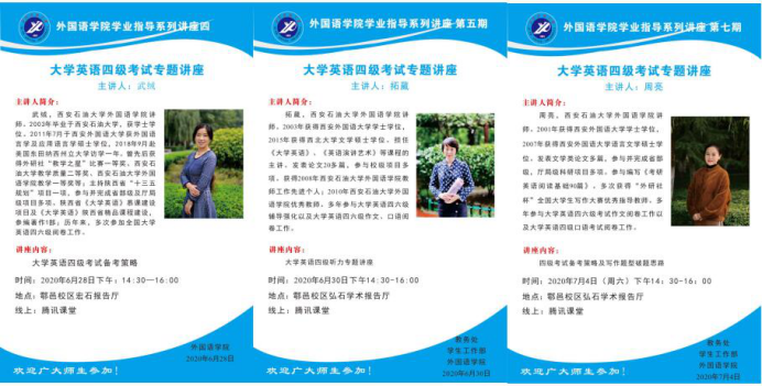 為了讓我學(xué)生全面了解大學(xué)英語(yǔ)四級(jí)考試,提升大學(xué)英語(yǔ)四級(jí)通過(guò)率,在教務(wù)處和學(xué)生工作部的支持下,外國(guó)語(yǔ)學(xué)院6月29日至7月7日分別舉辦五場(chǎng)大學(xué)英語(yǔ)四級(jí)講座。此次講座面向全校學(xué)生以線上和線下兩種方式進(jìn)行,線下主會(huì)場(chǎng)設(shè)在鄠邑校區(qū)弘石學(xué)術(shù)報(bào)告廳,分會(huì)場(chǎng)設(shè)在各四級(jí)強(qiáng)化輔導(dǎo)班教室,線上使用騰訊課堂直播,截至目前為止我校共有5342名同學(xué)通過(guò)線上線下方式參加了此次系列講座