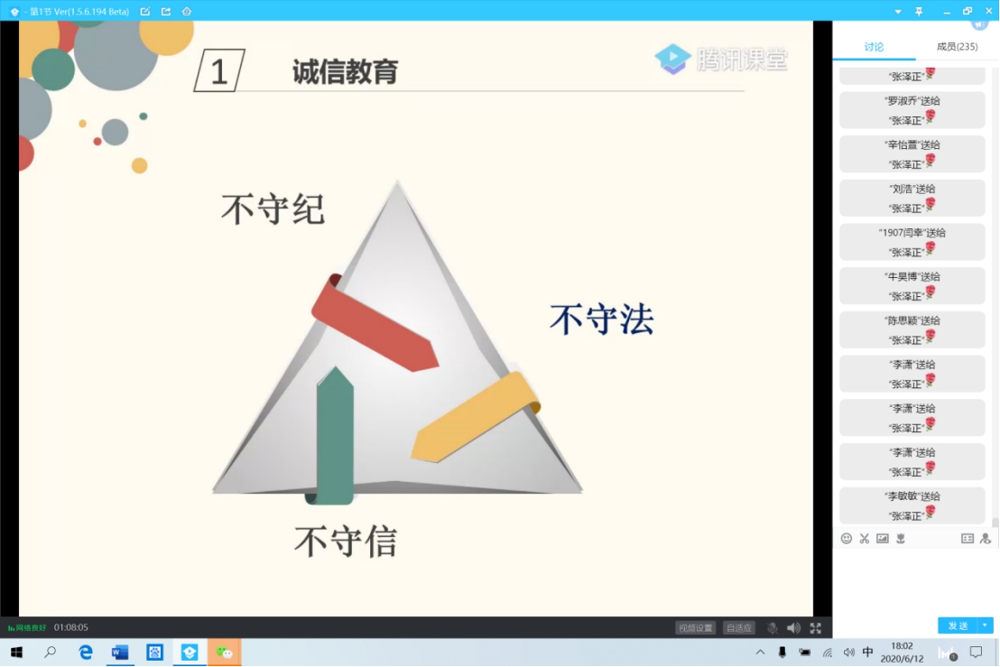除此之外,范老師和張老師還對(duì)同學(xué)們進(jìn)行了誠(chéng)信教育,強(qiáng)調(diào)誠(chéng)信重要性。兩位老師分別從考試作弊、“槍手”成風(fēng)、騙貸逃貸等大學(xué)生常見誠(chéng)信問題出發(fā),教育同學(xué)們樹立正確的是非道德觀念,做遵紀(jì)守法的新時(shí)代社會(huì)主義好青年。