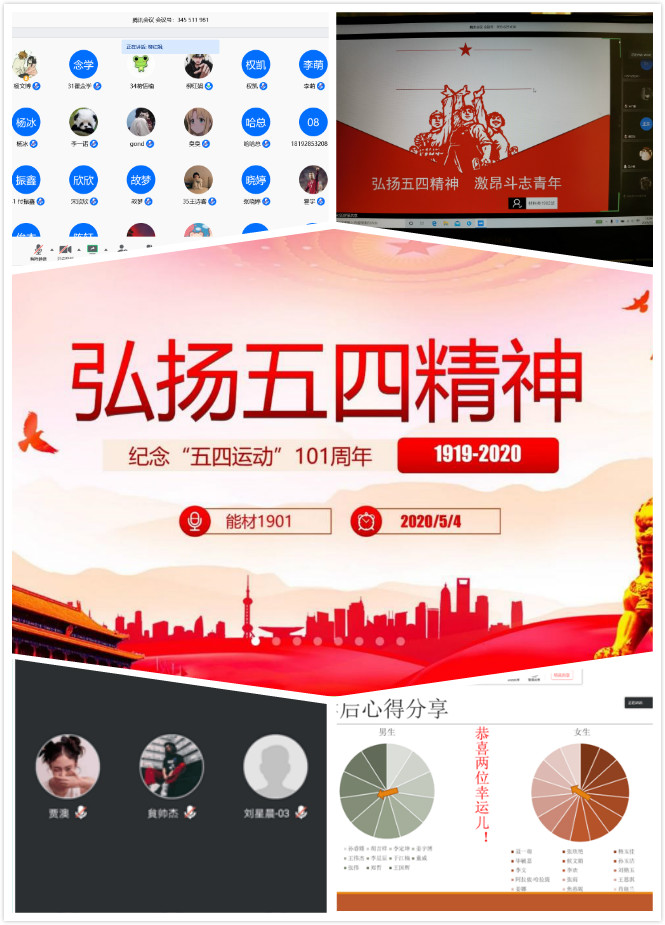 為紀(jì)念五四運動101周年,進(jìn)一步引導(dǎo)廣大青年團(tuán)員繼承和發(fā)揚(yáng)五四精神,展現(xiàn)當(dāng)代青年風(fēng)采。20205月,材料科學(xué)與工程學(xué)院各班、團(tuán)支部召開了以“傳承五四精神,弘揚(yáng)愛國情懷”、“青春向黨、歌頌五四”等為主題的線上班團(tuán)會。此次主題班團(tuán)會準(zhǔn)備充分,內(nèi)容充實,形式多樣。通過線上學(xué)習(xí)習(xí)近平總書記五四寄語和優(yōu)秀青年事跡、唱團(tuán)歌、經(jīng)典誦讀、知識競答、觀看五四精神紀(jì)錄片等方式,號召廣大團(tuán)員不忘入團(tuán)初心、牢記團(tuán)員使命,以實際行動傳承五四精神、弘揚(yáng)愛國情懷。