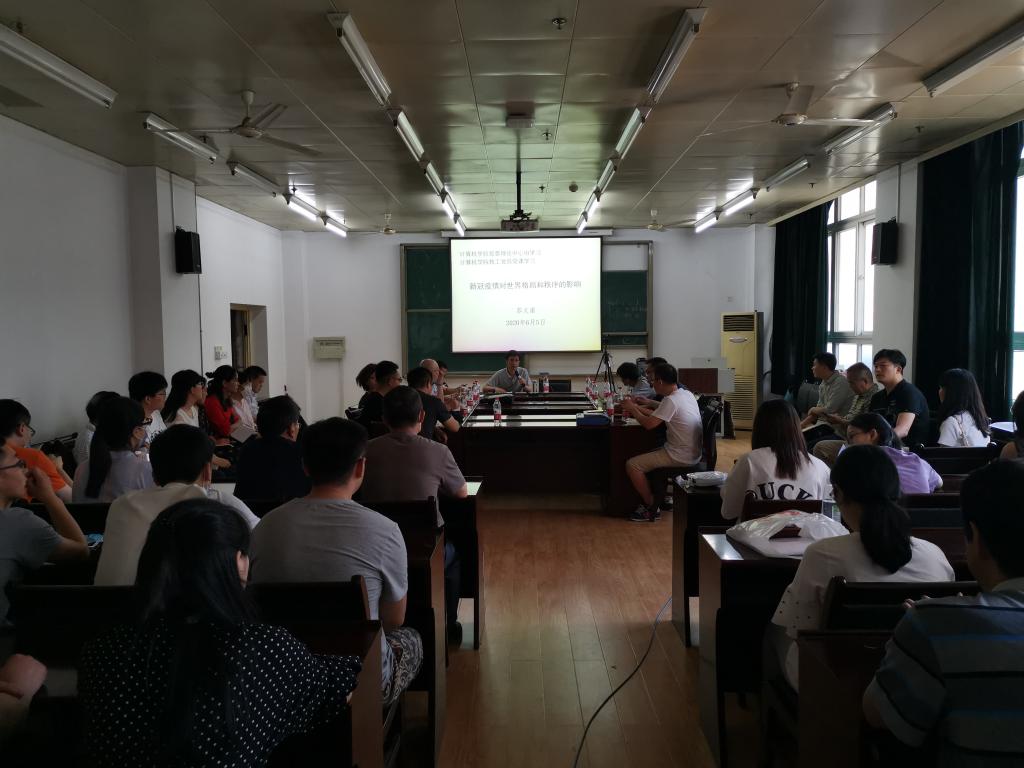 6月5日上午,副校長蘇文甫以《新冠疫情對世界格局和秩序的影響》為題,在雁塔校區(qū)2教402室為計算機學院全體教工黨員講授專題黨課。計算機學院黨委書記蔡建文主持本次黨課學習。