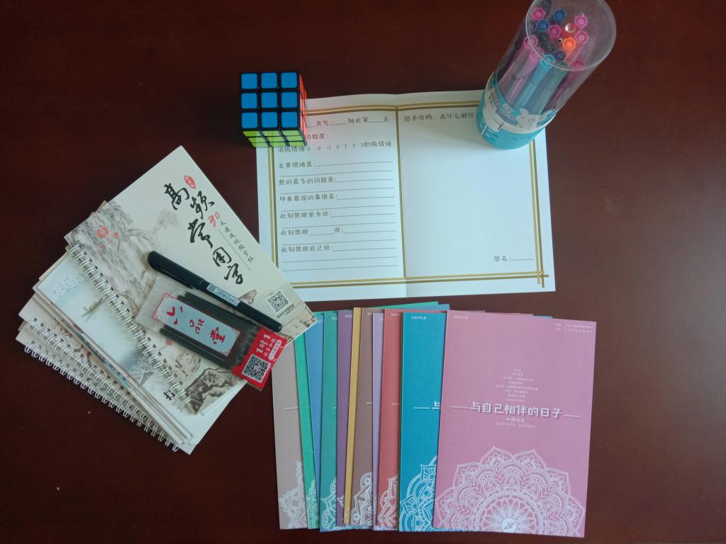“獨(dú)處時(shí)光·有愛(ài)相伴件套”是油緣心理老師特意為學(xué)生挑選的6種減壓益智的小工具,包括:察覺(jué)自我的心情日志手卡、礪心練腦的魔方、安心靜心的字帖、強(qiáng)身健體的呼啦圈、見(jiàn)證成長(zhǎng)的種子罐頭、專(zhuān)業(yè)陪伴的心理援助平臺(tái)?!芭c自己相伴的日子”心情日志手卡,由學(xué)生心理成長(zhǎng)指導(dǎo)中心策劃,人文學(xué)院文創(chuàng)中心精心設(shè)計(jì),以含有西安石油大學(xué)元素的14種顏色的14個(gè)曼陀羅手卡代表隔離的14天,讓學(xué)生每天覺(jué)察自己的情緒、書(shū)寫(xiě)自己的心聲、涂鴉自己的潛意識(shí)。在曼陀羅手卡的背景上,貼心送上油緣心理小建議,幫助學(xué)生在特殊的時(shí)期里好好愛(ài)自己。