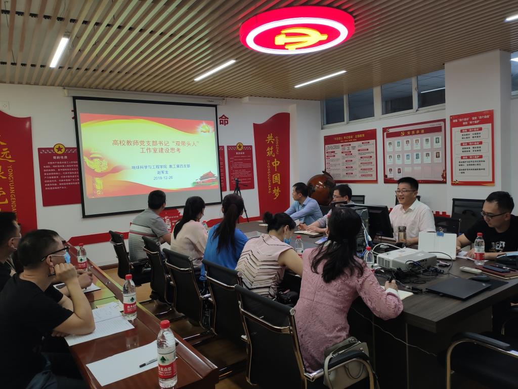 地球科學(xué)與工程學(xué)院教工第四黨支部書記趙軍龍首先介紹了高校教師黨支部書記“雙帶頭人”的提出背景、意義、內(nèi)涵和建設(shè)要求。他強(qiáng)調(diào)做好“雙帶頭人”培育工程的關(guān)鍵在于嚴(yán)選拔、配優(yōu)配強(qiáng)隊(duì)伍、提高支委理論和思想水平、重服務(wù)、培養(yǎng)服務(wù)意識。做好教師黨支部“雙帶頭人”的關(guān)鍵在于勤奮學(xué)習(xí)、以身示范、知行合一、真抓實(shí)干。接著,趙軍龍分享了“雙帶頭人”教師黨支部書記工作室的建設(shè)經(jīng)驗(yàn)、建設(shè)目標(biāo)、具體舉措及成效。他重點(diǎn)介紹了教工第四黨支部“雙帶頭人”黨支部書記工作室“1-3-8-2-3”建設(shè)思路、“雙帶頭人” 黨支部書記工作室的創(chuàng)新舉措、嚴(yán)謹(jǐn)規(guī)范的支部學(xué)習(xí)計(jì)劃、3年建設(shè)工作目標(biāo)和建設(shè)進(jìn)展分析等。
