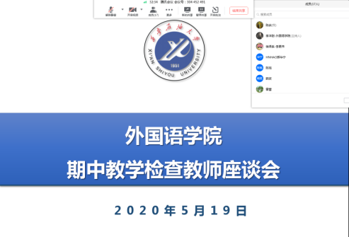為迎接學(xué)校期中教學(xué)檢查,外國語學(xué)院于2020年5月19日下午通過騰訊會(huì)議平臺(tái)舉行了期中教學(xué)檢查線上教師座談會(huì)。外國語學(xué)院教學(xué)副院長陳武主持召開了此次會(huì)議,校督導(dǎo)組組長郝華寧,校督導(dǎo)張倩霞、朱銀泉、劉紹東、王新建以及外國語學(xué)院各系部主任和教師代表、教學(xué)辦相關(guān)人員參加了此次座談會(huì)。