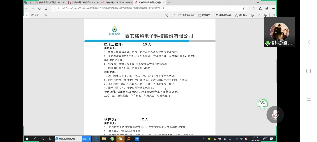 西安洛科電子科技股份有限公司總經(jīng)理蘭孟平結(jié)合PPT,向參會畢業(yè)生宣講介紹了洛科公司的發(fā)展史、經(jīng)營理念、企業(yè)文化、業(yè)務(wù)范圍、招聘需求等情況,重點介紹了不同崗位的工作性質(zhì)、福利待遇、工作地點等情況。此次洛科公司舉辦線上專場招聘會共需招聘技術(shù)工程師、開發(fā)助等崗位人員20人。隨后,參會畢業(yè)生就自己關(guān)注的具體問題與蘭孟平總經(jīng)理進(jìn)行了線上交流咨詢,蘭孟平總經(jīng)理表示誠摯邀請廣大畢業(yè)生到公司實習(xí)、考察,期待同學(xué)們加入快速發(fā)展的洛科電子大家庭。