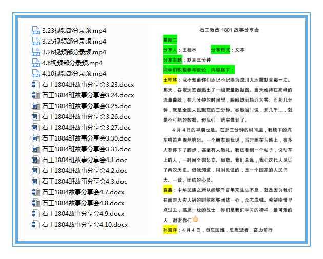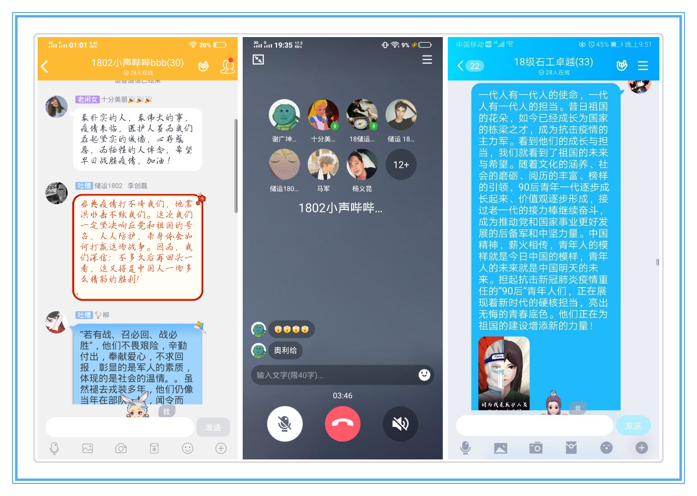 期間,各班級利用視頻分享或講述故事等形式在線上開展故事分享會96期,分享先鋒故事124個,分享的先鋒故事有按下暫停鍵,封一座城,護一國人,識大體、顧大局的武漢人民;有白衣執(zhí)甲,逆行出征,與死神斗爭的白衣天使;有聞令即動,勇挑重擔,敢打硬仗的人民軍隊;有夜以繼日,奮戰(zhàn)在尋常巷陌,守護著人民家園的社區(qū)工作者;有不辱使命,日夜奮戰(zhàn),將崗位安在疫情前線的人民警察;有奔走在大街小巷、田間地頭,牢守疫情最后一公里的基層干部;有奔赴不同崗位,真誠奉獻,匯聚抗疫強大力量的志愿者;更有用行動彰顯大國氣魄與風范,打贏抗疫大考,為國際社會貢獻抗疫智慧、輸送抗疫物資的中國政府。
