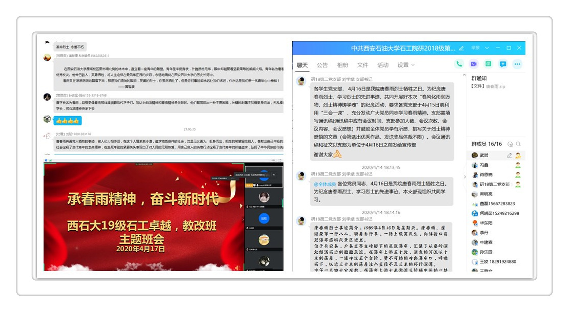 正直疫情防控期間,學(xué)生們無法來到現(xiàn)場緬懷烈士。為表示對唐春雨同志的追思,鼓勵更多青年學(xué)生了解和學(xué)習傳承“春雨精,學(xué)院于4月初開始,開展了線上系列紀念活動。各學(xué)生黨支部積極開展以學(xué)習“春雨精為主題的“三會一課”活動;馬克思主義研習社石油工程學(xué)院分社就緬懷唐春雨烈士、學(xué)習“春雨精舉辦了線上專題研討會;各團支部也分別召開了學(xué)習唐春雨烈士事跡和“春雨精神”的主題團會;2018級和2019級本科生還聯(lián)合制作了配樂詩朗誦《春雨頌》紀念烈士。同時,石油工程學(xué)院還積極向全體學(xué)生征集學(xué)習“春雨精感悟的文章,并利用石工青年等媒體平臺積極宣傳分享,諸多線上活動取得良好成效。