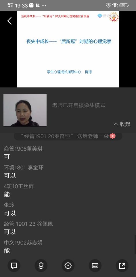 為加強疫情期間師生的心理健康教育,促進師生在突發(fā)公共衛(wèi)生事件后的心理成長,413日晚,我校學生心理成長指導(dǎo)中心主任肖瓊教授在騰訊課堂進行了《喪失中成長——“后新冠”時期的心理覺察》專題講座,我校部分師生、全校心理委員近1000人在線觀看學習。