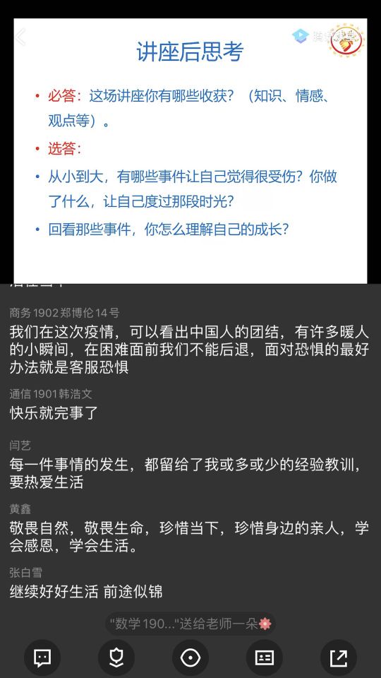 講座結(jié)束時,肖老師請同學們思考并回答與成長有關(guān)的三個問題,同學們積極踴躍參與問答,紛紛表示通過講座學會了如何面對喪失,并感受到了自己成長的力量。