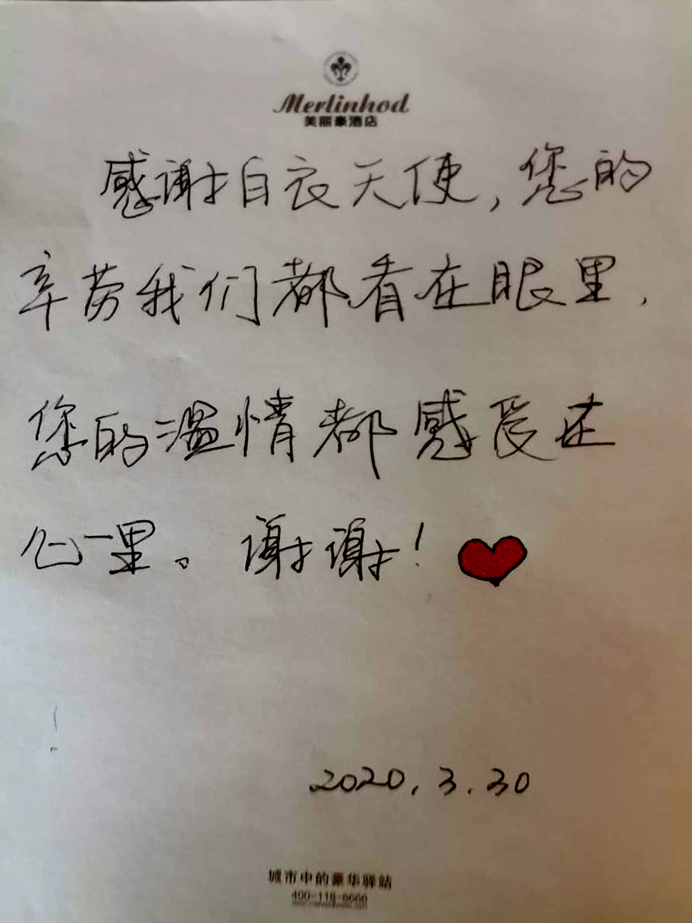 當(dāng)我們每次拖著疲憊的身體回房間時(shí),看到多封暖心的感謝信,信中表示我們工作很辛苦,對(duì)我們衷心的感謝,期待我們也平安而歸,瞬間心暖,再累也值得,我想這是對(duì)我們最大的安慰和鼓勵(lì)??粗晃晃坏母綦x期滿的人員笑容滿面的離開,我們也算是心愿以償,一定不負(fù)校醫(yī)院院領(lǐng)導(dǎo)的重托,全力以赴地戰(zhàn)勝疫情,期待疫去花開,大家生活平安健康,我們平安而歸。