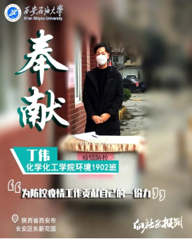 應(yīng)化1602班、能化1702班預(yù)備黨員李婧瑤、羅文鈺,環(huán)境1902班共青團(tuán)員丁偉等,防疫期間主動(dòng)投身社區(qū)志愿者工作,包括提醒戶主做好每日消毒防護(hù),對(duì)小區(qū)出入人員按照規(guī)定進(jìn)行勸返或登記、消毒、體溫檢測(cè)工作。服務(wù)在陜西合陽縣城關(guān)鎮(zhèn)泰山社區(qū)抽黃北新小區(qū)的李靖瑤說:“作為一名共產(chǎn)黨員,我堅(jiān)決執(zhí)行小區(qū)委員會(huì)的命令,嚴(yán)格服從黨的命令,希望我們?cè)缛諔?zhàn)勝疫情,打贏這場(chǎng)疫情阻擊戰(zhàn)?!绷_文鈺表示:“在防疫期間,能夠有機(jī)會(huì)為抗擊疫情獻(xiàn)出自己的綿薄之力,作為一名中共預(yù)備黨員,我深感光榮,希望能用實(shí)際行動(dòng),讓社區(qū)的鄰居們感受到我們志愿者的幫助和溫暖?!蓖瑫r(shí)協(xié)助西安市長(zhǎng)安區(qū)青年南街東新花園社區(qū)做好疫情排查防控工作的丁偉表示:“我沒想到,我的舉手之勞也得到了校團(tuán)委的肯定,將我微小的事跡在西石大官方微博上進(jìn)行了報(bào)道,這無疑是學(xué)校對(duì)我的一份肯定和激勵(lì),我更應(yīng)該在這次疫情中奉獻(xiàn)自身的力量?!?/span>