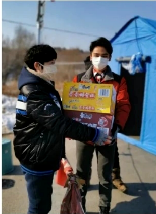 李一星(右一)為工作人員捐贈(zèng)防疫生活物資