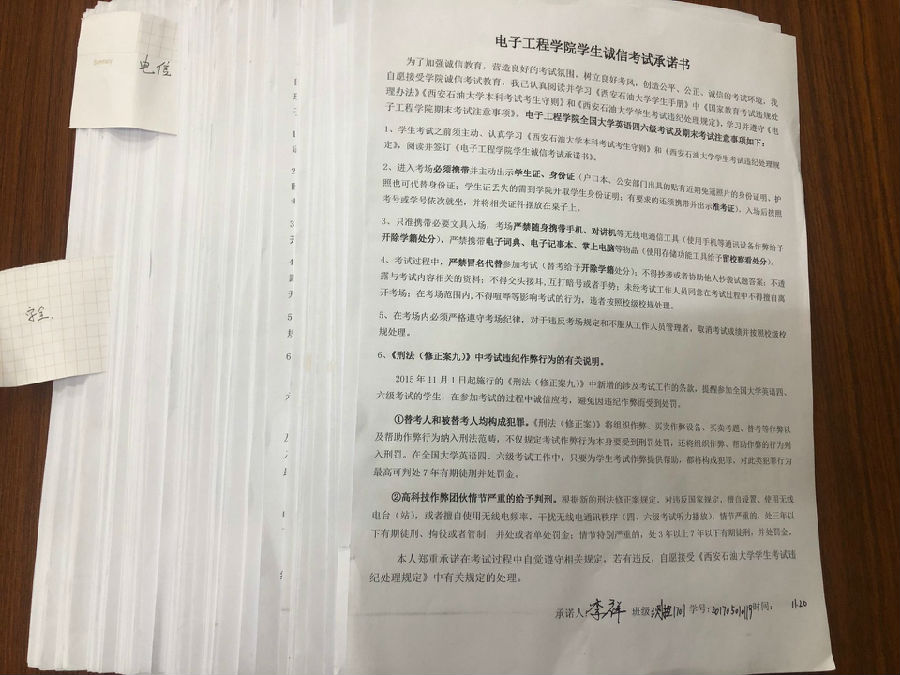 系列活動之簽署誠信考試承諾書。為進(jìn)一步加強(qiáng)學(xué)生誠信意識,將誠信考試落到實處,確保將考試相關(guān)紀(jì)律要求傳達(dá)給每一名同學(xué),堅決抵制作弊行為,各班級印制承諾書,組織各班級同學(xué)簽署誠信考試承諾書,要求同學(xué)們謹(jǐn)記承諾內(nèi)容,克服僥幸心理,自覺抵制作弊行為,力求達(dá)到教育廣大學(xué)生誠信考試的目的,激發(fā)學(xué)生學(xué)習(xí)動力。