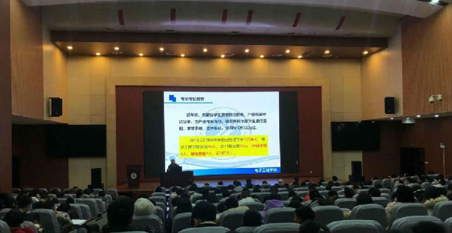 系列活動之召開學(xué)風(fēng)考風(fēng)推進(jìn)會議。電子工程學(xué)院2017級輔導(dǎo)員高建邦分專業(yè)對學(xué)院2017級學(xué)生召開學(xué)風(fēng)考風(fēng)推進(jìn)會議。高建邦老師首先對學(xué)生進(jìn)行誠信教育,提高大學(xué)生的誠信應(yīng)考意識,引導(dǎo)青年學(xué)生牢固樹立守信光榮、失信可恥的道德觀念。隨后,高老師對考試紀(jì)律規(guī)定,違紀(jì)處分管理規(guī)定等方面做了詳細(xì)介紹,并通報了近年來因作弊處分的學(xué)生情況,讓同學(xué)們深刻認(rèn)識到違反制度對自身發(fā)展的影響。