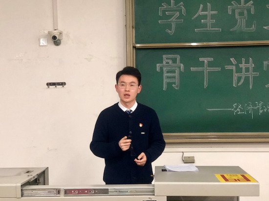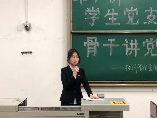 經(jīng)濟系學生黨支部副書記丁子悅同志以《悟初心,守初心,踐初心,做新時代優(yōu)秀黨員》為題第二個登場。他詳細講解了“什么是初心”、“堅持黨領導一切的忠心”、“為人民服務的赤子之心”,以及“實現(xiàn)中華民族偉大復興的信心”這四個方面,強調(diào) “不忘初心、牢記使命”不僅是習近平總書記發(fā)出的偉大號召,更是處于新時代的青年黨員所應該擔起的責任。