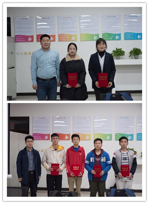 朱戰(zhàn)威老師與張浩然老師共同對石工院新一屆易班工作站學(xué)生干部頒發(fā)聘書。