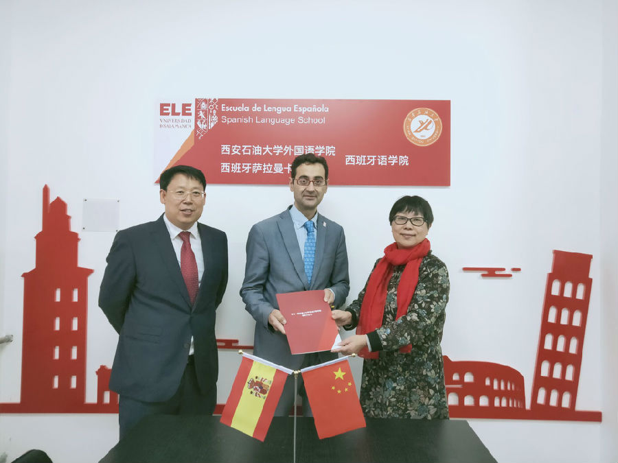 西班牙薩拉曼卡大學(xué)校務(wù)委員一行到外國語學(xué)院交流訪問,與學(xué)院領(lǐng)導(dǎo)舉行座談,就具體合作事宜達(dá)成了基本共識(shí)和約定,簽署了合作備忘錄,會(huì)后舉行了西安石油大學(xué)外國語學(xué)院-西班牙薩拉曼卡大學(xué)西班牙語中心的掛牌儀式,標(biāo)志著我院西班牙語中心的正式成立。