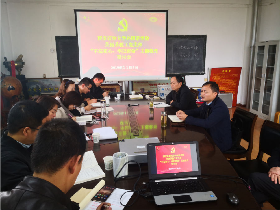11月5日下午,外國(guó)語(yǔ)學(xué)院英語(yǔ)系教工黨支部在雁塔校區(qū)第一教學(xué)樓701會(huì)議室開(kāi)展了支部書(shū)記講黨課學(xué)習(xí)活動(dòng)暨“不忘初心、牢記使命”專題教育研討會(huì),研討會(huì)由外國(guó)語(yǔ)學(xué)院副院長(zhǎng)、英語(yǔ)系黨支部書(shū)記陳武主持。