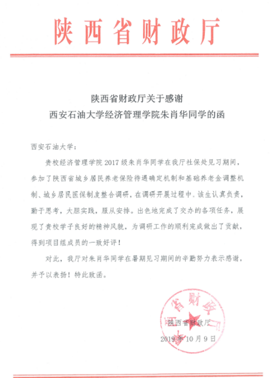 ?近日,陜西省財(cái)政廳向我校經(jīng)濟(jì)管理學(xué)院發(fā)來感謝函,對(duì)我校2017級(jí)會(huì)計(jì)專業(yè)碩士朱肖華同學(xué)提出表揚(yáng),高度評(píng)價(jià)該同學(xué)在暑期見習(xí)期間的工作表現(xiàn)。