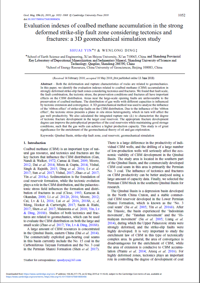 根據(jù)2019年9月份公布的ESI數(shù)據(jù)庫最新顯示,地球科學與工程學院一篇論文成功入選地質學領域TOP1%高被引論文,一年內被引頻次達到9次。該論文題為“Evaluation indexes of coalbed methane accumulation in the strong deformed strike-slip fault zone considering tectonics and fractures: A 3D geomechanical simulation study”,于2019年6月發(fā)表于地質類期刊《Geological Magazine》。第一作者為地球科學與工程學院尹帥博士,第一單位為西安石油大學。