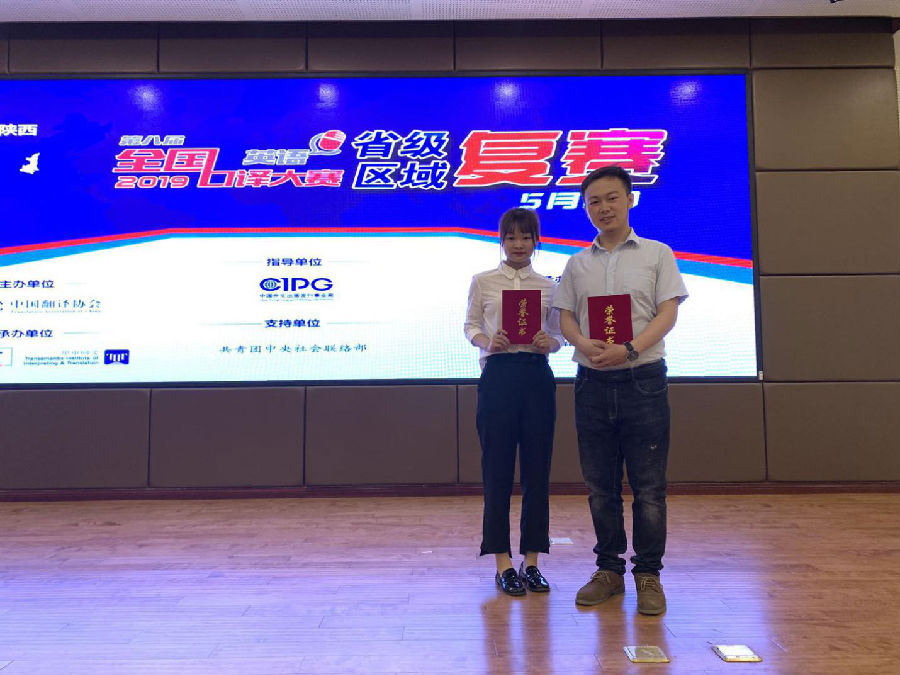 5月11日,2019年第八屆全國口譯大賽(英語)陜西賽區(qū)復(fù)賽在西安科技大學(xué)臨潼校區(qū)舉行。本次陜西賽區(qū)復(fù)賽由西安科技大學(xué)和華譯教育咨詢有限公司聯(lián)合組織實施,來自全省高校的百余名選手參加了比賽。我校外國語學(xué)院派出4名學(xué)生參加本次比賽,其中,2017級翻譯碩士研究生劉耀以排名第七的好成績獲得二等獎,成功晉級大區(qū)賽。2018級翻譯碩士研究生易可獲得三等獎。