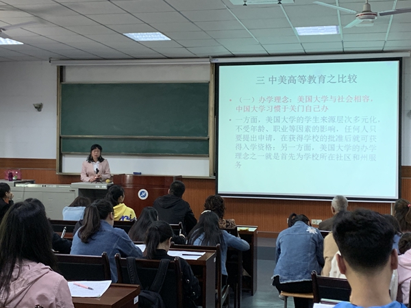 朱海娟副教授,畢業(yè)于西北農(nóng)林科技大學(xué)獲博士學(xué)位,西北大學(xué)博士后,美國(guó)路易斯安那大學(xué)拉法葉分校訪(fǎng)問(wèn)學(xué)者,報(bào)告的題目為《中美高等教育比較研究》。報(bào)告主要內(nèi)容對(duì)比了中美高等教育在辦學(xué)理念、教育目標(biāo)、教學(xué)組織方式的差異,并通過(guò)學(xué)術(shù)誠(chéng)實(shí)教育、教學(xué)設(shè)施配置、畢業(yè)典禮等細(xì)節(jié),指出了美國(guó)高等教育中普遍存在的開(kāi)放、以人為本、注重綜合素質(zhì)培養(yǎng)、教學(xué)方式靈活等特征。