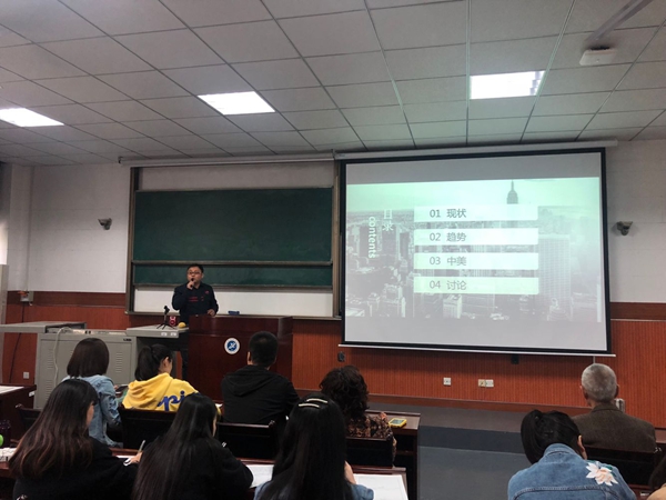 陳丁博士,畢業(yè)于西安交通大學(xué)獲博士學(xué)位,美國(guó)堪薩斯大學(xué)訪(fǎng)問(wèn)學(xué)者,報(bào)告題目為《多棱鏡下的美國(guó)》。報(bào)告主要內(nèi)容從社會(huì)、教育、民生、環(huán)境等多個(gè)角度,展示、分析當(dāng)今美國(guó)的發(fā)展現(xiàn)狀;通過(guò)對(duì)比美國(guó)十年間的變化,探討了未來(lái)美國(guó)的可能發(fā)展走勢(shì);并對(duì)中美間未來(lái)的關(guān)系特征提出自己的判斷,并對(duì)計(jì)劃前往美國(guó)學(xué)習(xí)、訪(fǎng)問(wèn)、工作的聽(tīng)眾,提供了個(gè)人建議。