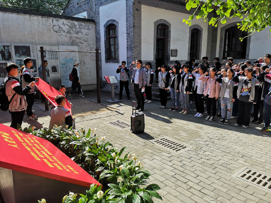 在校歌《輝煌明天》的激昂旋律中,歷時一個多小時到達(dá)了八路軍辦事處紀(jì)念館。在參觀前,同學(xué)們集體奏唱國歌,然后,張嘉豪同學(xué)與李渲同學(xué)獻(xiàn)上了深情的朗誦來表達(dá)自己對革命先烈的無限敬仰之情,最后梁琦老師帶領(lǐng)同學(xué)們莊嚴(yán)宣誓,并叮囑同學(xué)們注意自身安全的同時,希望各位學(xué)員能夠沿著紅色足跡重走信仰之路,銘記光輝歷史、傳承紅色基因。