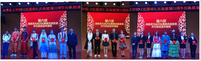 經(jīng)過激烈角逐,由學生工作處,化學化工學院黨委、團委、學生黨團員代表及學生會代表的8人評審團,按照選題立意、朗誦內(nèi)容、作品感染力、個人儀態(tài)、現(xiàn)場效果等方面,對參賽作品逐一進行打分。最終環(huán)境1701班塔衣爾·米吉提、化工1802班如孜古麗·麥麥提等8名選手帶來《感恩祖國 祝愿祖國》與化卓1801班馬再升同學帶來的《與祖國同行 筑華夏輝煌》榮獲一等獎;應化1601班旦增格列、環(huán)境1603班阿依巴拉·色里克別克等8人共同演繹的《盛開的團結之花》與環(huán)境1802班杜娜、化工1802班王新玥分別朗誦的《換了人間》《走向屬于您的明天》獲得二等獎;應化1803班楊蓉、能化1802班高雨如帶來的《我的祖國》,化工1701班阿依尼格爾·艾山、化卓1801班李闊等6人朗誦的《民族大團結》,化工1704班馬志新、化工1801班李成蘭等8名同學帶來了《為偉大的盛典歌唱》榮獲三等獎。與會領導老師為獲獎選手代表逐一頒獎。