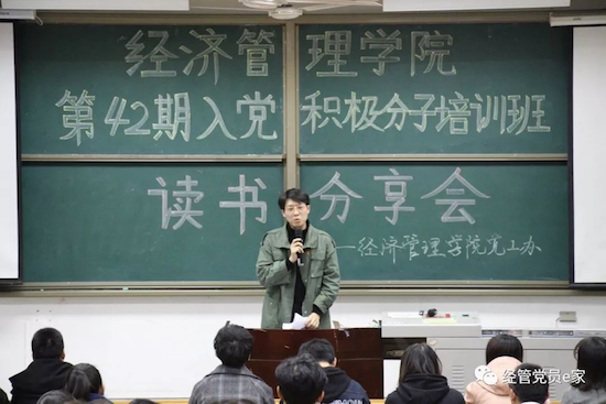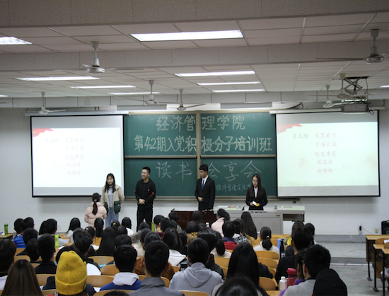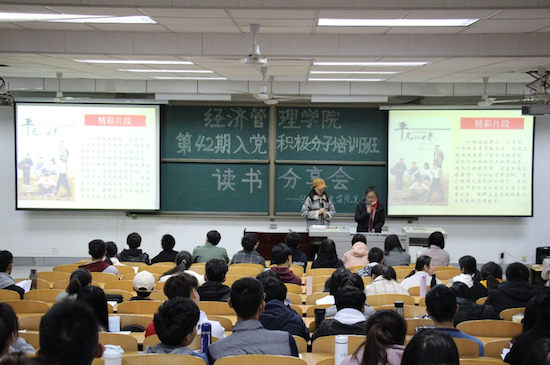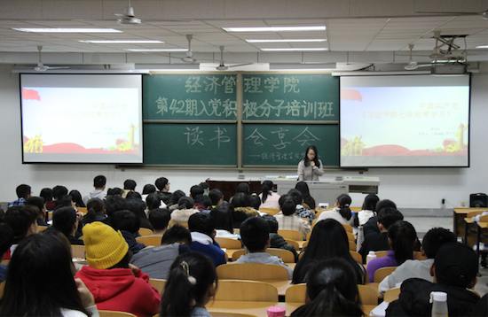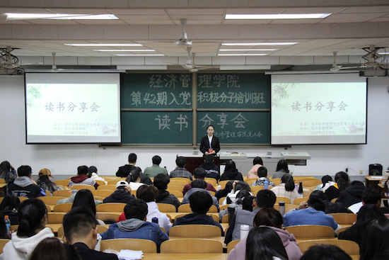 為深入學習黨的十九大精神,學好黨的知識,提高黨性修養(yǎng),同時豐富課余生活,陶冶情操,擴展知識面,增加文化素養(yǎng),提高個人修養(yǎng),11月28-29日晚,由經(jīng)濟管理學院黨委主辦,學生黨建工作辦公室承辦的“書香校園建設”系列活動之“讀書分享會”于鄠邑校區(qū)教學A區(qū)139教室順利舉行,黨工辦學生干部、入黨積極分子200余人參加。