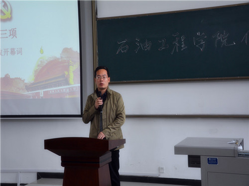 為深入學(xué)習(xí)貫徹習(xí)近平新時代中國特色社會主義思想和黨的十九大精神,落實(shí)全國高校思想政治工作會議精神,進(jìn)一步推進(jìn)“兩學(xué)一做”學(xué)習(xí)教育常態(tài)化制度化,響應(yīng)學(xué)校要求,推動我院學(xué)生黨支部建設(shè),提高學(xué)生黨支部組織生活的質(zhì)量和效果,增強(qiáng)學(xué)生黨支部的創(chuàng)造力、凝聚力和戰(zhàn)斗力,石油工程學(xué)院黨委于2018年10月24日中午12:30在鄠邑校區(qū)石工地科樓115教室舉行了學(xué)生黨支部優(yōu)秀組織生活創(chuàng)新案例評選活動。學(xué)院黨委書記馬勇、黨委副書記張建高、黨委組織委員孫會珠、化學(xué)化工學(xué)院黨委兼職組織員屈敏佳、經(jīng)濟(jì)管理學(xué)院黨委兼職組織員武威受邀參加并擔(dān)任評委,學(xué)院全體輔導(dǎo)員及130余名學(xué)生黨員也參加了活動。