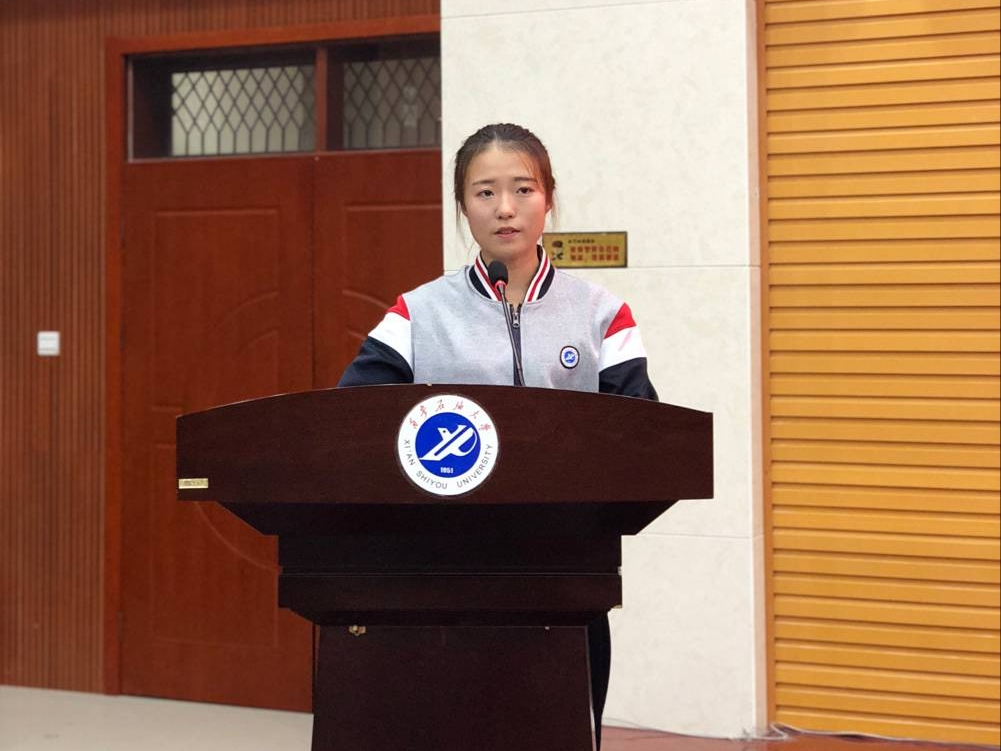見(jiàn)面會(huì)上,學(xué)院領(lǐng)導(dǎo)及嘉賓為新生代表佩戴了?;?,參會(huì)老師和新生都為自己佩戴上了學(xué)校校徽。?;张宕鲀x式使得師生見(jiàn)面會(huì)更具有儀式感,讓新生們更加以西石大人的身份而自豪、榮耀。應(yīng)化1803班楊蓉同學(xué)在見(jiàn)面會(huì)上做了新生代表發(fā)言。