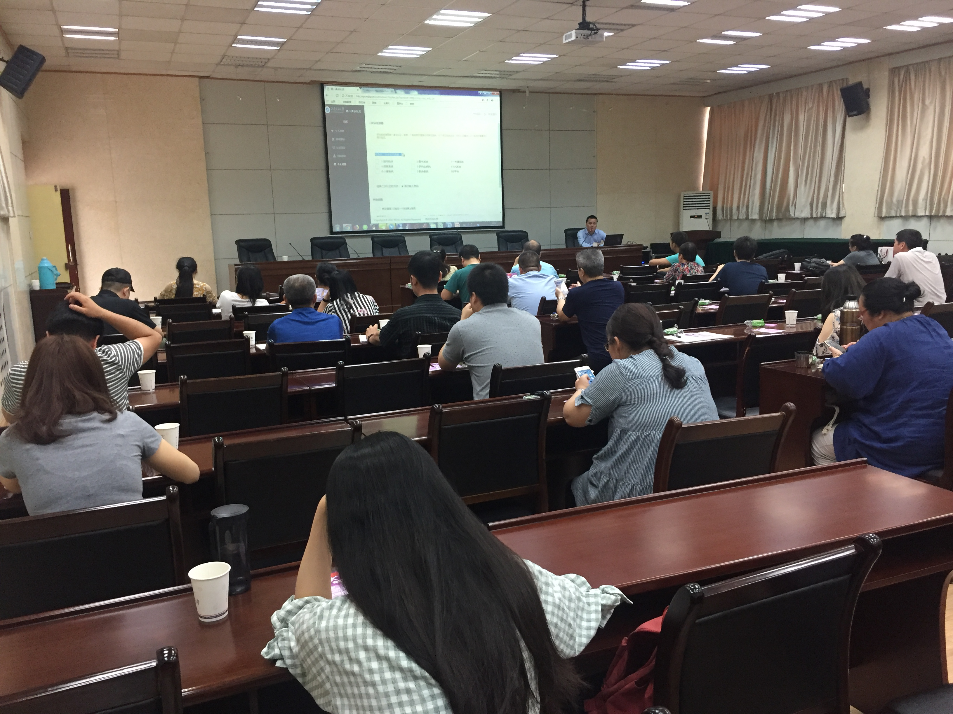 本次培訓(xùn)的數(shù)字化校園基礎(chǔ)平臺(tái)實(shí)現(xiàn)了我校各業(yè)務(wù)系統(tǒng)之間的數(shù)據(jù)融合與共享以及統(tǒng)一身份認(rèn)證等功能;移動(dòng)校園平臺(tái)為全校師生提供了一個(gè)便捷了解校園動(dòng)態(tài)及個(gè)人工作與生活等信息的應(yīng)用服務(wù)。培訓(xùn)會(huì)上,首先針對(duì)移動(dòng)校園平臺(tái)的使用和管理等內(nèi)容進(jìn)行了細(xì)致講解,分別從資源、教學(xué)、科研三個(gè)方面為參會(huì)老師介紹了“i西石大APP”和“西安石油大學(xué)微信企業(yè)號(hào)”兩個(gè)移動(dòng)端應(yīng)用平臺(tái)的各項(xiàng)功能,并幫助參會(huì)教師下載APP和掃描二維碼進(jìn)行現(xiàn)場(chǎng)演示。通過(guò)線上簽到、點(diǎn)名、問(wèn)題答疑等方式與教師進(jìn)行互動(dòng),現(xiàn)場(chǎng)氣氛活躍。同時(shí),技術(shù)人員針對(duì)數(shù)字校園基礎(chǔ)平臺(tái)的各項(xiàng)功能進(jìn)行了講解,并重點(diǎn)介紹了各業(yè)務(wù)系統(tǒng)的統(tǒng)一身份認(rèn)證集成和數(shù)據(jù)融合共享情況,并對(duì)統(tǒng)一身份認(rèn)證和服務(wù)門(mén)戶(hù)各欄目的使用和注意事項(xiàng)進(jìn)行了演示和說(shuō)明,對(duì)平臺(tái)中提供的校內(nèi)咨詢(xún)欄目(例如:你問(wèn)我答、調(diào)查問(wèn)卷、領(lǐng)導(dǎo)信箱等)如何進(jìn)行問(wèn)題管理、審核與回復(fù)進(jìn)行了詳細(xì)演示。