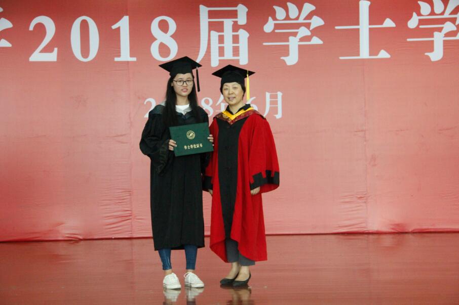 隨后,授位儀式正式開始,在歡快的音樂聲中,獲得學(xué)士學(xué)位的同學(xué)們一一上臺(tái),由教授委員會(huì)各位導(dǎo)師授予學(xué)位,并合影留念。