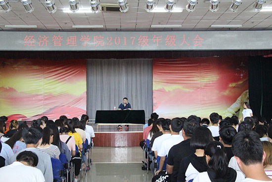 2018年6月13日12時10分,經(jīng)濟管理學院在新校區(qū)騰輝大學生活動中心成功召開了經(jīng)管院2017級年級大會。經(jīng)濟管理學院學生管理辦公室主任劉冰老師、團學指導老師兼2017級學生輔導員王璟老師出席了本次會議。經(jīng)濟管理學院2017級全體學生參加了此次大會。