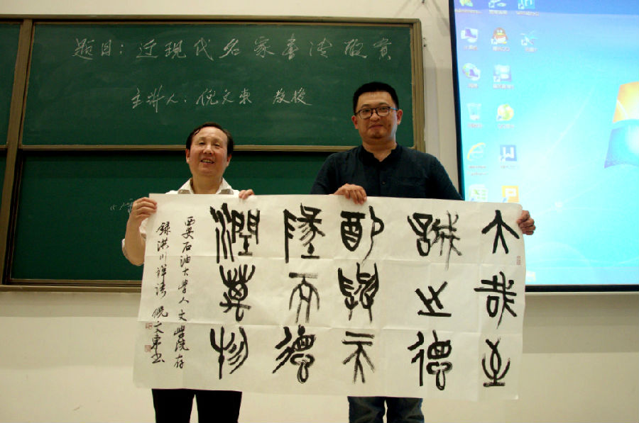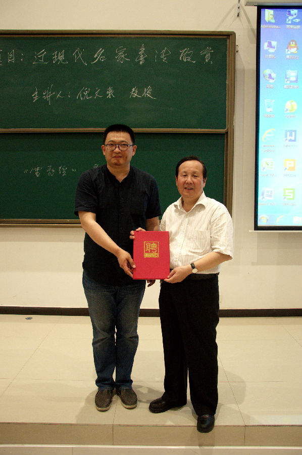 倪文東教授選取了于右任、李叔同、沈尹默、沙孟海、啟功等十位近現(xiàn)代書法名家,結(jié)合其生平事跡、學(xué)書經(jīng)歷分析了其書法造詣、枚舉了其書法創(chuàng)新特點、評價了其在中國書法史上的重要地位。倪教授認(rèn)為書法非寫字,中國書法根植于博大精深的中國傳統(tǒng)文化,學(xué)書必要有深厚的學(xué)養(yǎng)、廣博的積淀再加以超乎常人的勤學(xué)苦練方可有所成就。倪教授告誡學(xué)子們,功夫在“書”外,學(xué)書要以提高自身的文化素質(zhì)修養(yǎng)為前提。倪教授的講座深入淺出、詼諧風(fēng)趣,贏得了老師、學(xué)生們的陣陣掌聲。