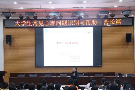 為落實我校第三屆“陽光護航”心理育人宣傳季活動計劃,提升經(jīng)濟管理學院“陽光護航”心理育人月系列活動水平,2018年4月12日晚,經(jīng)濟管理學院邀請我校學生心理成長指導中心主任肖瓊副教授在經(jīng)管人文樓118室舉辦《大學生心理問題識別與幫助——舍長篇》專題講座。經(jīng)管院各年級輔導員和2015、2016級宿舍長300余人參加此次活動。